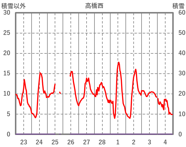 | 日 | 時 | 気温 | 降水 | 風向/風速 | 日照 | 積雪 | 降雪 |