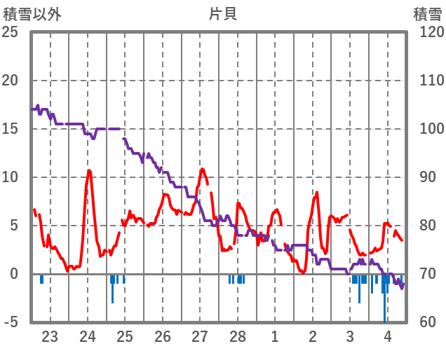 | 日 | 時 | 気温 | 降水 | 風向/風速 | 日照 | 積雪 | 降雪 |