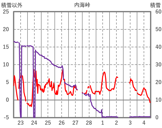 | 日 | 時 | 気温 | 降水 | 風向/風速 | 日照 | 積雪 | 降雪 |
