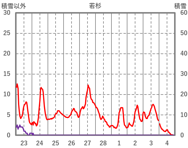 | 日 | 時 | 気温 | 降水 | 風向/風速 | 日照 | 積雪 | 降雪 |