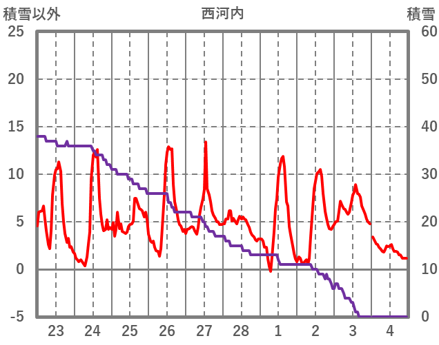 | 日 | 時 | 気温 | 降水 | 風向/風速 | 日照 | 積雪 | 降雪 |