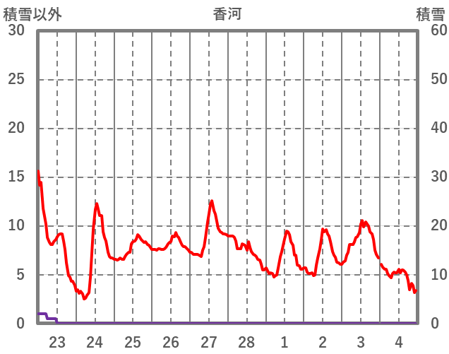 | 日 | 時 | 気温 | 降水 | 風向/風速 | 日照 | 積雪 | 降雪 |