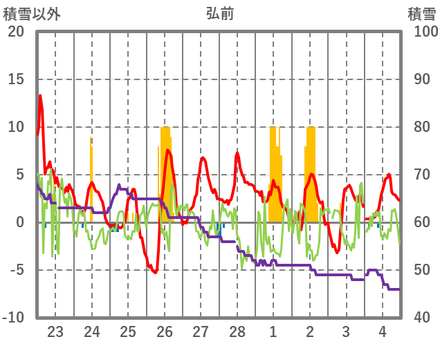 | 日 | 時 | 気温 | 降水 | 風向/風速 | 日照 | 積雪 | 降雪 |