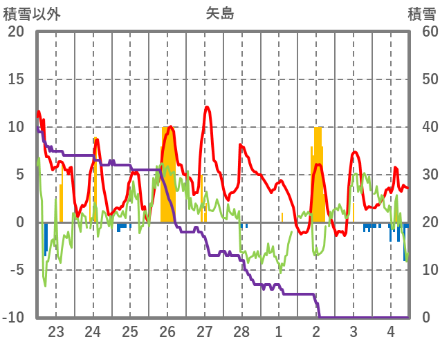 | 日 | 時 | 気温 | 降水 | 風向/風速 | 日照 | 積雪 | 降雪 |