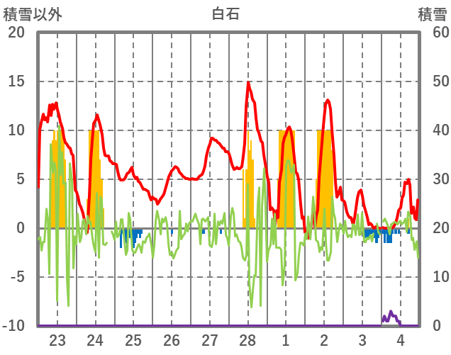 | 日 | 時 | 気温 | 降水 | 風向/風速 | 日照 | 積雪 | 降雪 |