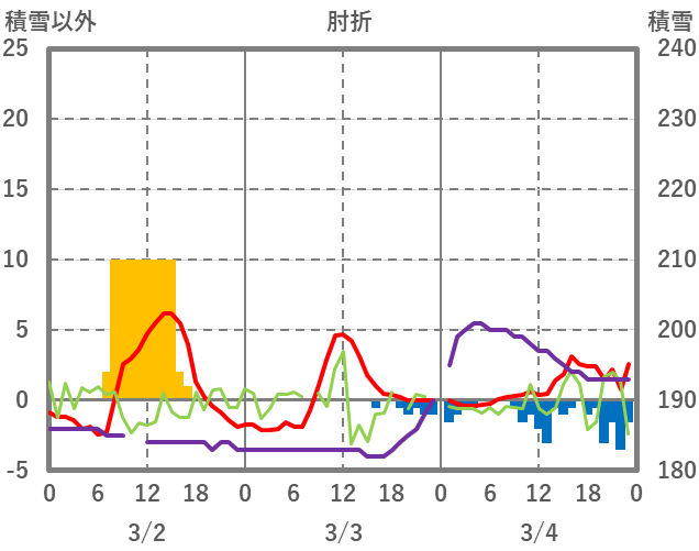 | 日 | 時 | 気温 | 降水 | 風向/風速 | 日照 | 積雪 | 降雪 |