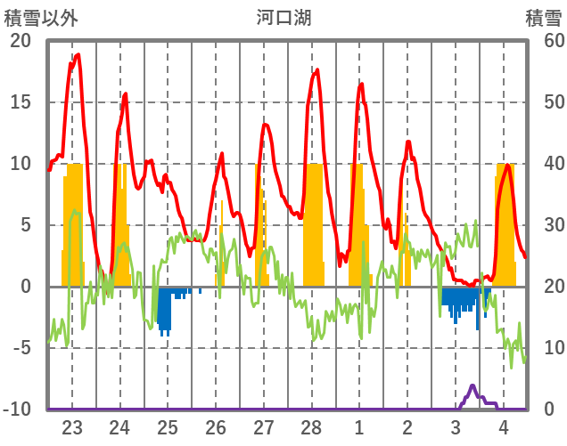 | 日 | 時 | 気温 | 降水 | 風向/風速 | 日照 | 積雪 | 降雪 |