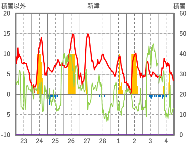 | 日 | 時 | 気温 | 降水 | 風向/風速 | 日照 | 積雪 | 降雪 |