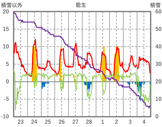 | 日 | 時 | 気温 | 降水 | 風向/風速 | 日照 | 積雪 | 降雪 |