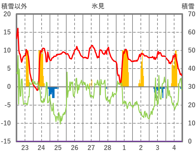 | 日 | 時 | 気温 | 降水 | 風向/風速 | 日照 | 積雪 | 降雪 |