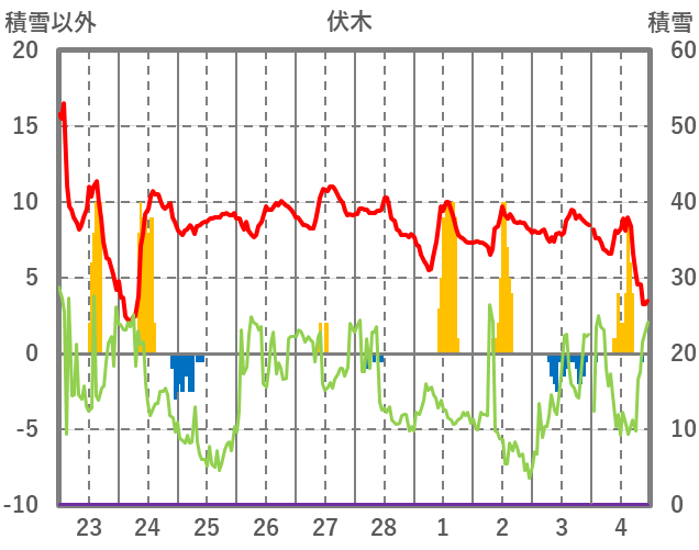 | 日 | 時 | 気温 | 降水 | 風向/風速 | 日照 | 積雪 | 降雪 |