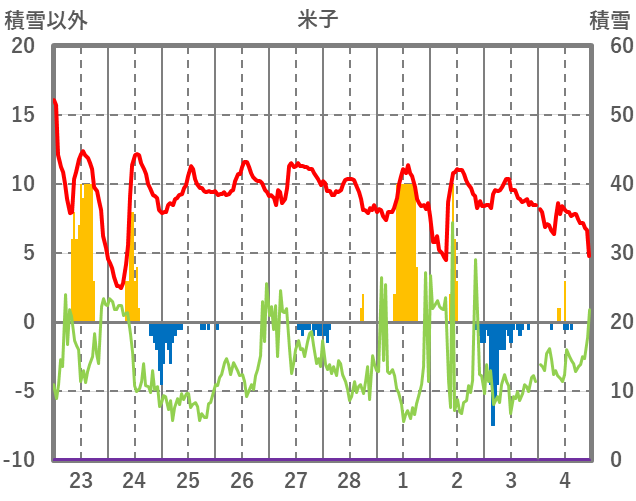 | 日 | 時 | 気温 | 降水 | 風向/風速 | 日照 | 積雪 | 降雪 |