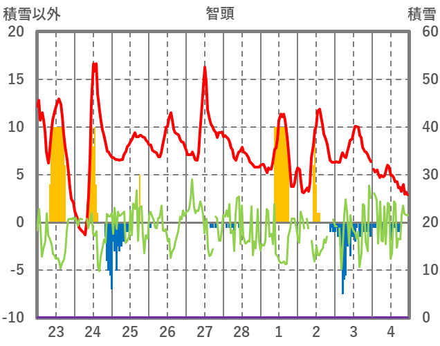 | 日 | 時 | 気温 | 降水 | 風向/風速 | 日照 | 積雪 | 降雪 |