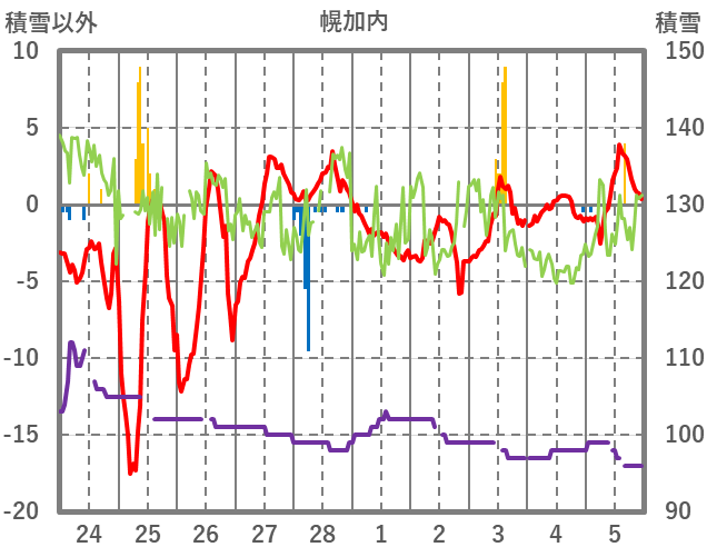 | 日 | 時 | 気温 | 降水 | 風向/風速 | 日照 | 積雪 | 降雪 |