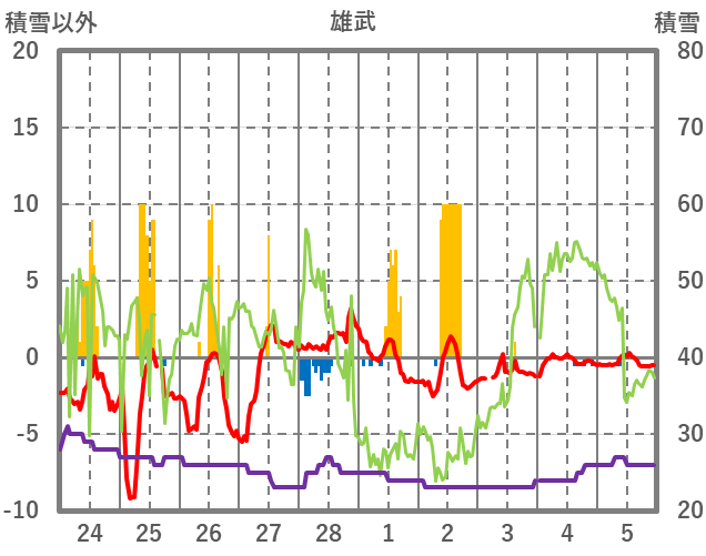 | 日 | 時 | 気温 | 降水 | 風向/風速 | 日照 | 積雪 | 降雪 |