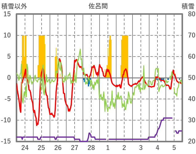 | 日 | 時 | 気温 | 降水 | 風向/風速 | 日照 | 積雪 | 降雪 |