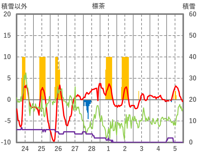 | 日 | 時 | 気温 | 降水 | 風向/風速 | 日照 | 積雪 | 降雪 |