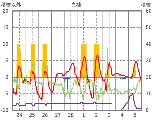 | 日 | 時 | 気温 | 降水 | 風向/風速 | 日照 | 積雪 | 降雪 |