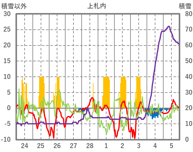 | 日 | 時 | 気温 | 降水 | 風向/風速 | 日照 | 積雪 | 降雪 |