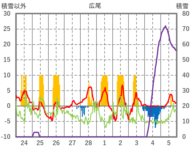 | 日 | 時 | 気温 | 降水 | 風向/風速 | 日照 | 積雪 | 降雪 |