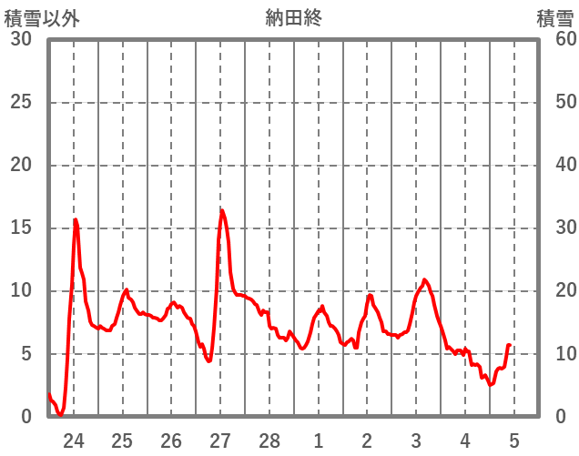 | 日 | 時 | 気温 | 降水 | 風向/風速 | 日照 | 積雪 | 降雪 |