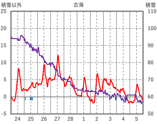 | 日 | 時 | 気温 | 降水 | 風向/風速 | 日照 | 積雪 | 降雪 |