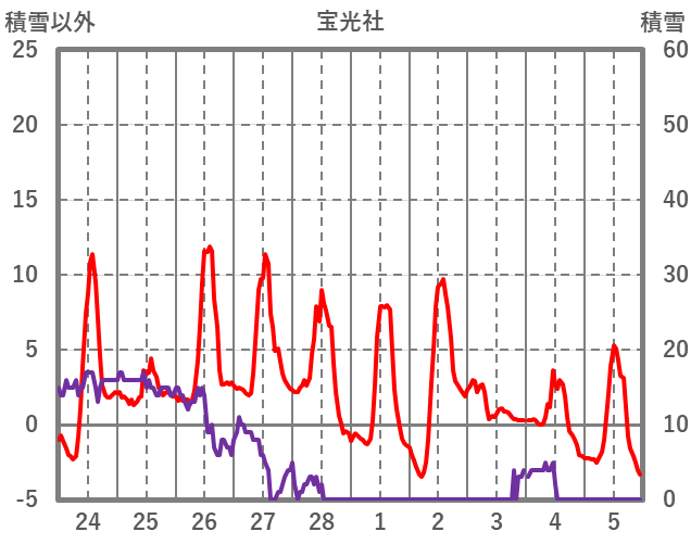 | 日 | 時 | 気温 | 降水 | 風向/風速 | 日照 | 積雪 | 降雪 |