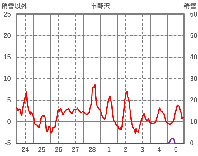| 日 | 時 | 気温 | 降水 | 風向/風速 | 日照 | 積雪 | 降雪 |