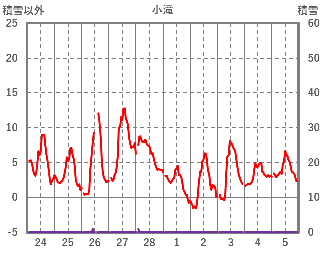| 日 | 時 | 気温 | 降水 | 風向/風速 | 日照 | 積雪 | 降雪 |