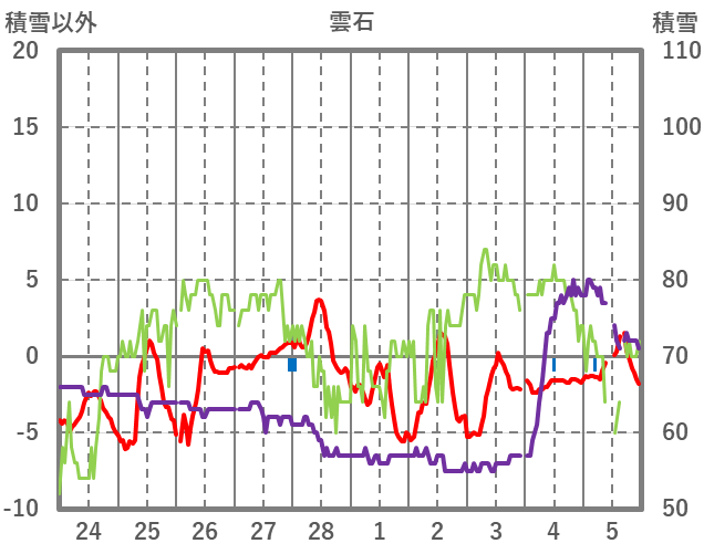 | 日 | 時 | 気温 | 降水 | 風向/風速 | 日照 | 積雪 | 降雪 |