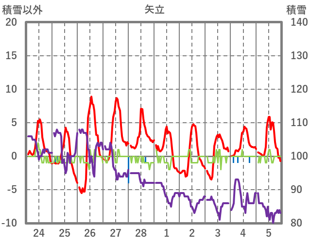 | 日 | 時 | 気温 | 降水 | 風向/風速 | 日照 | 積雪 | 降雪 |