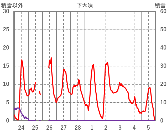 | 日 | 時 | 気温 | 降水 | 風向/風速 | 日照 | 積雪 | 降雪 |
