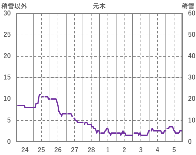 | 日 | 時 | 気温 | 降水 | 風向/風速 | 日照 | 積雪 | 降雪 |