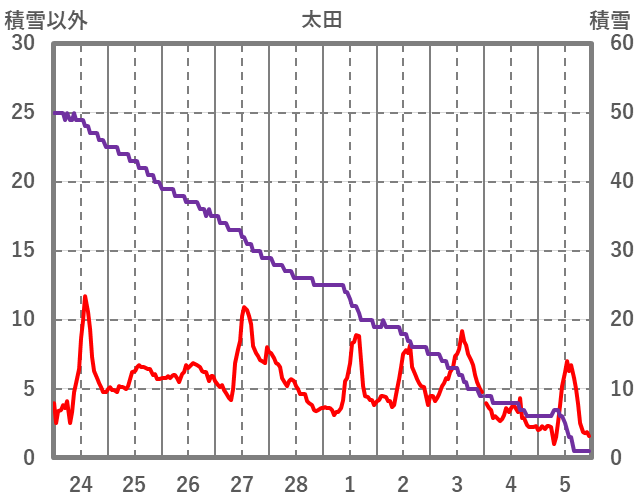 | 日 | 時 | 気温 | 降水 | 風向/風速 | 日照 | 積雪 | 降雪 |
