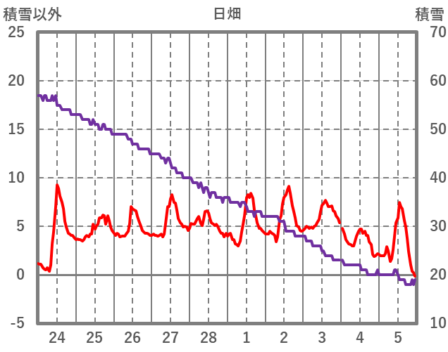 | 日 | 時 | 気温 | 降水 | 風向/風速 | 日照 | 積雪 | 降雪 |