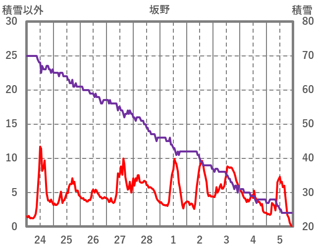 | 日 | 時 | 気温 | 降水 | 風向/風速 | 日照 | 積雪 | 降雪 |