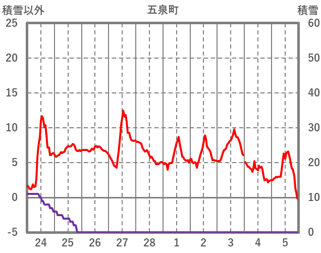 | 日 | 時 | 気温 | 降水 | 風向/風速 | 日照 | 積雪 | 降雪 |
