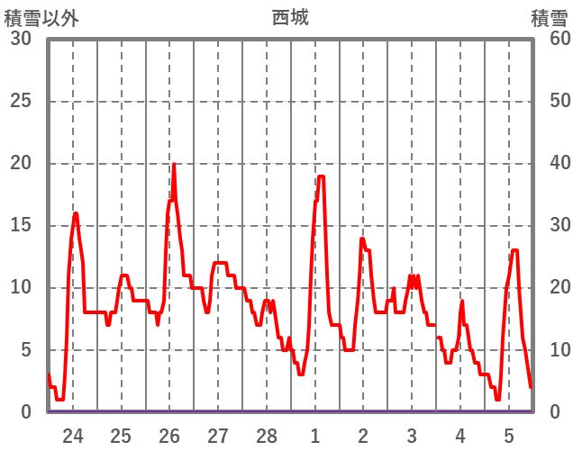 | 日 | 時 | 気温 | 降水 | 風向/風速 | 日照 | 積雪 | 降雪 |