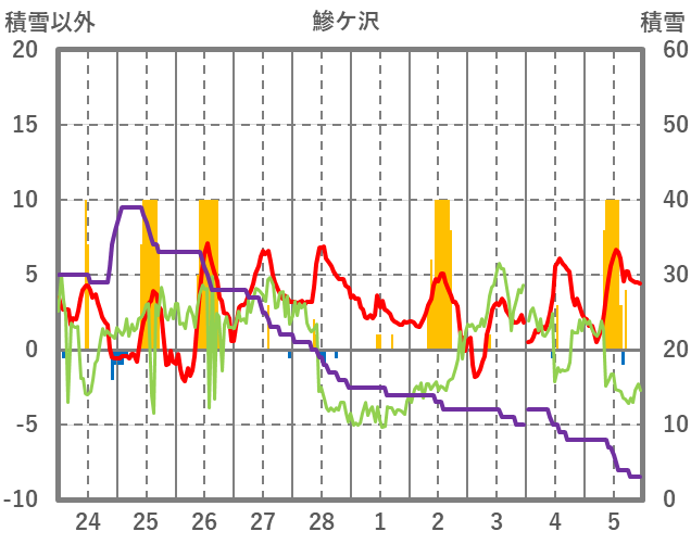 | 日 | 時 | 気温 | 降水 | 風向/風速 | 日照 | 積雪 | 降雪 |