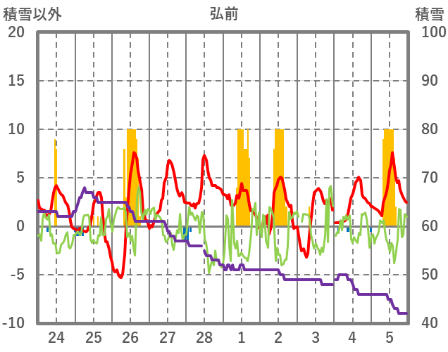 | 日 | 時 | 気温 | 降水 | 風向/風速 | 日照 | 積雪 | 降雪 |