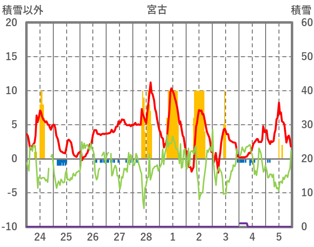 | 日 | 時 | 気温 | 降水 | 風向/風速 | 日照 | 積雪 | 降雪 |