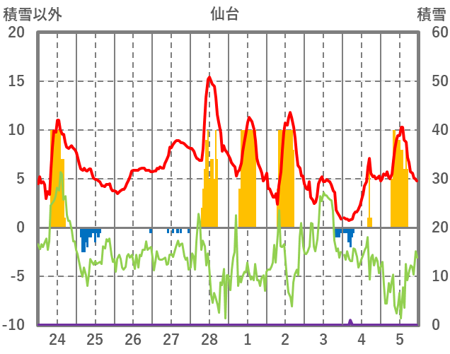 | 日 | 時 | 気温 | 降水 | 風向/風速 | 日照 | 積雪 | 降雪 |
