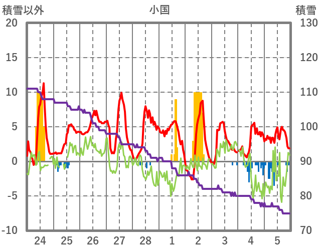 | 日 | 時 | 気温 | 降水 | 風向/風速 | 日照 | 積雪 | 降雪 |