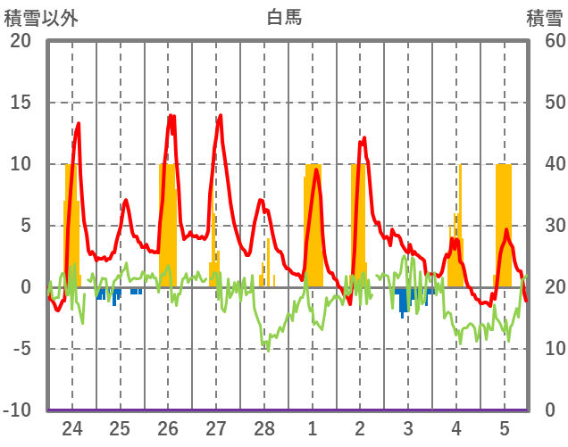 | 日 | 時 | 気温 | 降水 | 風向/風速 | 日照 | 積雪 | 降雪 |