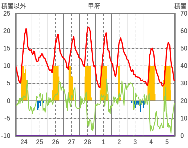 | 日 | 時 | 気温 | 降水 | 風向/風速 | 日照 | 積雪 | 降雪 |