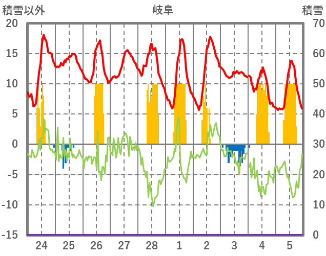 | 日 | 時 | 気温 | 降水 | 風向/風速 | 日照 | 積雪 | 降雪 |