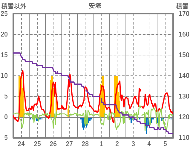 | 日 | 時 | 気温 | 降水 | 風向/風速 | 日照 | 積雪 | 降雪 |