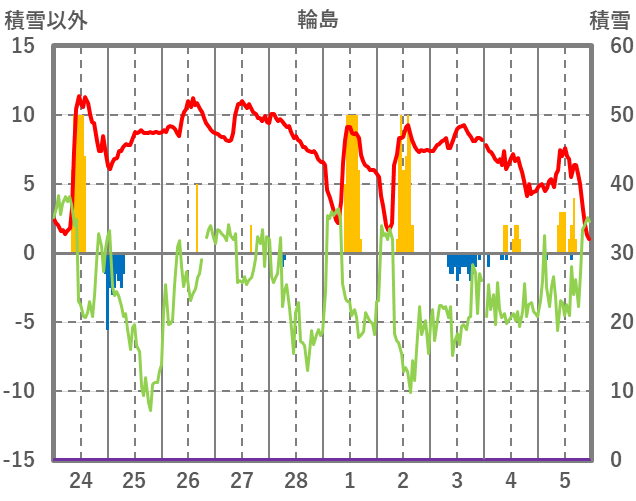 | 日 | 時 | 気温 | 降水 | 風向/風速 | 日照 | 積雪 | 降雪 |