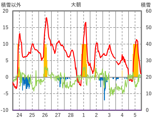 | 日 | 時 | 気温 | 降水 | 風向/風速 | 日照 | 積雪 | 降雪 |