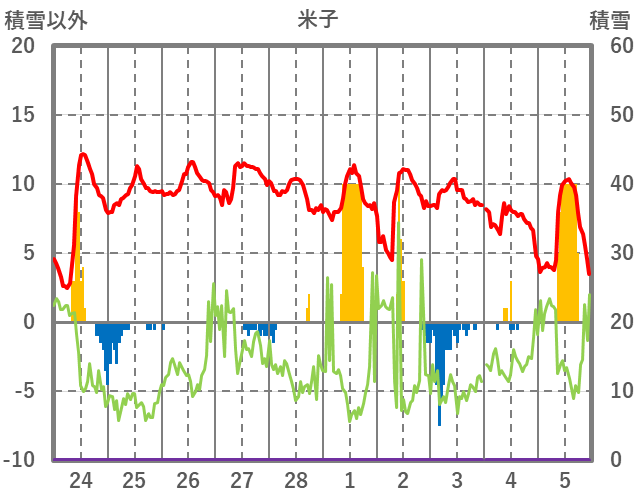 | 日 | 時 | 気温 | 降水 | 風向/風速 | 日照 | 積雪 | 降雪 |